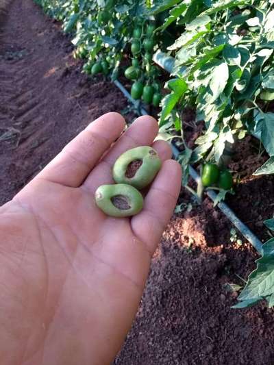 Aconteceu aqui e vi que eram grilos, eles comem quando pequeno daí o fruto ainda cresce mas com esse buraco. Como minha horta é pequena consegui vê foi uma guerra mas matei todos