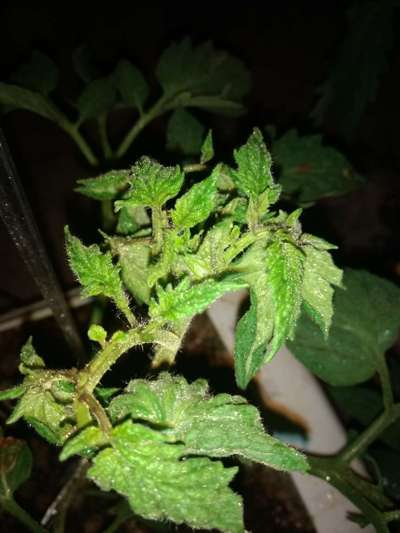 Mosca branca ou tripse, as mesma pode esta liberando toxina causando esse enrolamento das folha outra causa visose deixando folhas atrofiadas.