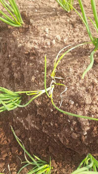வெங்காயத்தாளில் இடைப்பட்ட பகுதியை மட்டும் ஓட்டை விழுகிறது ஒட்டிவிடும் பகுதி மட்டுமே சாம்பல் நிறத்தில் தென்பட்டு முற்றிலும் எரிந்து விழுகிறது வெங்காயம் வளர்ச்சி குன்றி அப்படியே நின்று விடுகிறது இது முதலில் நிழல் பட்ட பகுதியில் முதலில் தென்படுகிறது என்ன காரணம்
