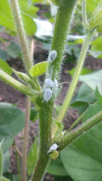 Hi Rajeshwar Reddy Welcome to Plantix Community. These are mealybugs. At the base level Mealybugs do seem harmless but when insect infestation increases in number the consequences include weak plant, curling and yellowing of leaves. 1 Remove all the Infected leaves. Chemical Control of Mealybug in Cotton Profenophos 1.5 ml/l + soap solution (1%) OR Acephate 1 g/l Neem Seed Kernel Extract(NSKE 5%) 5ml/l or Neemoil 5ml/ l + detergent powder 1gm/l can be sprayed as spot application on infested stalks. Fish oil resin liquid 10ml mixed with neem10ml/l or Karanj oil 10ml /l may be sprayed. As the last option, spray acephate 75 SP 1 g/l OR quinalphos 25 EC 2 ml/l or chlorpyriphos 25 EC 2ml/l or profenophos 50 EC 2 ml or thiodicarb 75 WP 2gm/l