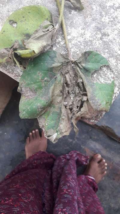 పై చిత్రం లో నా పంట చేను ప్రత్తి ఆకులు ఇలా పాలిపోయి, ఆకు ఎండిపోయి ఆకు రాలిపోతుంది.