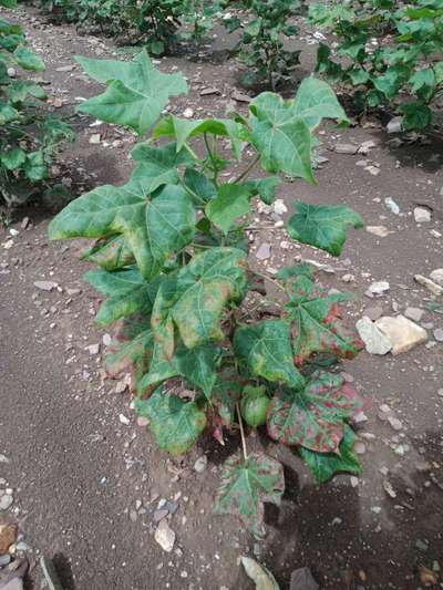కిందనుండి ఆకులు ఎర్రబడి పై పైకి వస్తున్నాయి అలాగే తెల్లదోమ ఆకుపచ్చ దోమ వుంది.
