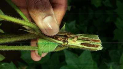ప్రత్తి పంటలో కొమ్మల మధ్యలో పురుగు ఉంది