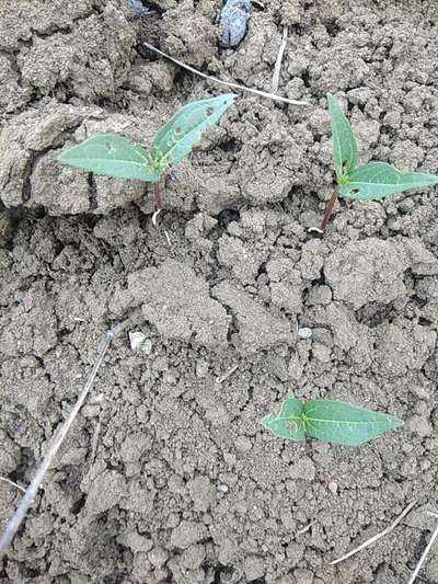holes on leaves.it may beFlea Beetle damage.spray chloropyriphos or Malathion or lambda cyhalothrin. kindly refer plantix library for more information and description of the problem and management. click on blue link to access the library. Thanks