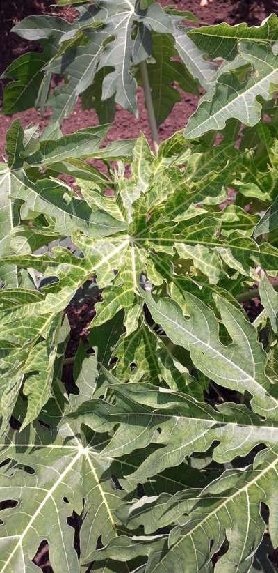 ఆకులు తెల్ల మచ్చలు,ఆకులపైనా చిన్ని వృత్తకారంలో చారలు మరియు ఆకులు పసుపు రంగులోకి మారుతున్నాయి అలాగే చేట్లు ఎడగడం లేదు