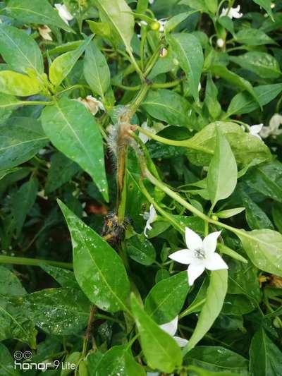 ఆకులకు వెనుక భాగాన మరియు పువ్వు దగ్గర తెలుపు, నలుపు రంగులో చిన్న చిన్న పురుగులు ఉన్నాయి.