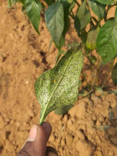 మిరప తోటలో ఆకు వెనక భాగంలో నల్లని పేలు లాంటి మరియు తెల్ల దోమలు ఏర్పాటు ఆకు పూర్తిగా నల్లబడి,రాలిపోయింది