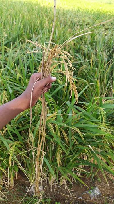 పొలం మధ్యలో అక్కడక్కడా వరి గంటలతో సహా పూర్తి గా గుంపులు గుంపులుగా ఎండిన గడ్డి లాగా తయారవుతుంది