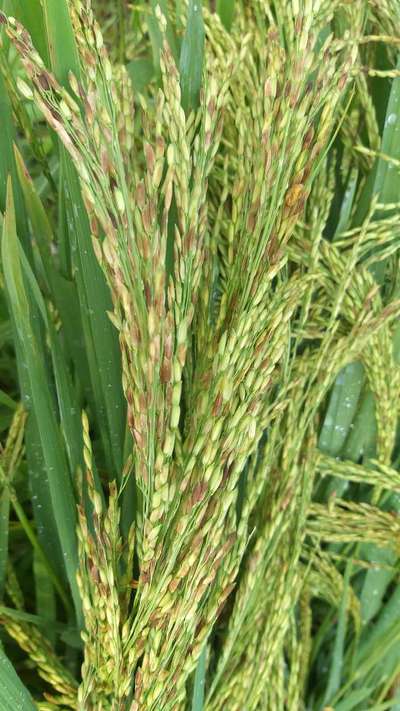 Dear Srinivas G, Rice Bug can't do emptying so many grains in a spikelet. Rather we can guess it as a characteristic symptom of Bacterial Panicle Blight of rice and also associated with a sign of False Smut. Pls let me know your furthest feedback 😂