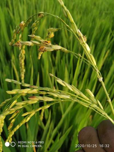 Hello dear Hari how are you dear the symptom is seem to be False Smut Bacterial Panicle Blight dear spray coppor oxychloride for control