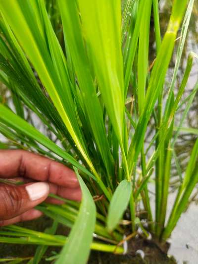 వరి ఆకు మధ్యలో తెల్లటి మచ్చలు వస్తుంది. దీనికి గల కారణం తెలుపుతూ, పరిస్కారం తెలపండి