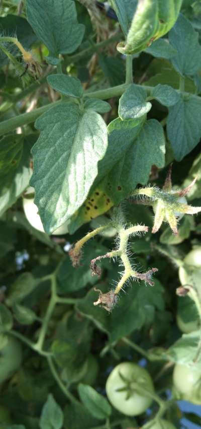 Hello dear Venu Raju how are you dear the symptom is seem to be Bacterial Spot and Speck of Tomato spray streptomycine or coppor oxychloride dear